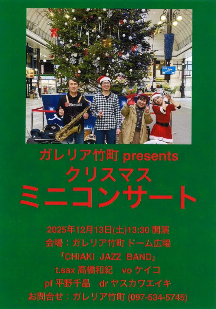 2025/12/13(土)13:30~ クリスマスミニコンサート開催 atガレリア竹町 投稿者: 大分市竹町通商店街振興組合まちなかエンジン2025年12月9日2025年12月9日イベント情報、お知らせ、ガレリア竹町ドーム広場、竹町通商店街振興組合