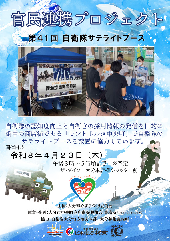 官民連携プロジェクトの一環として、自衛隊の認知度向上および自衛官の採用情報発信を目的に、セントポルタ中央町商店街にて自衛隊のサテライトブースを設置いたします。