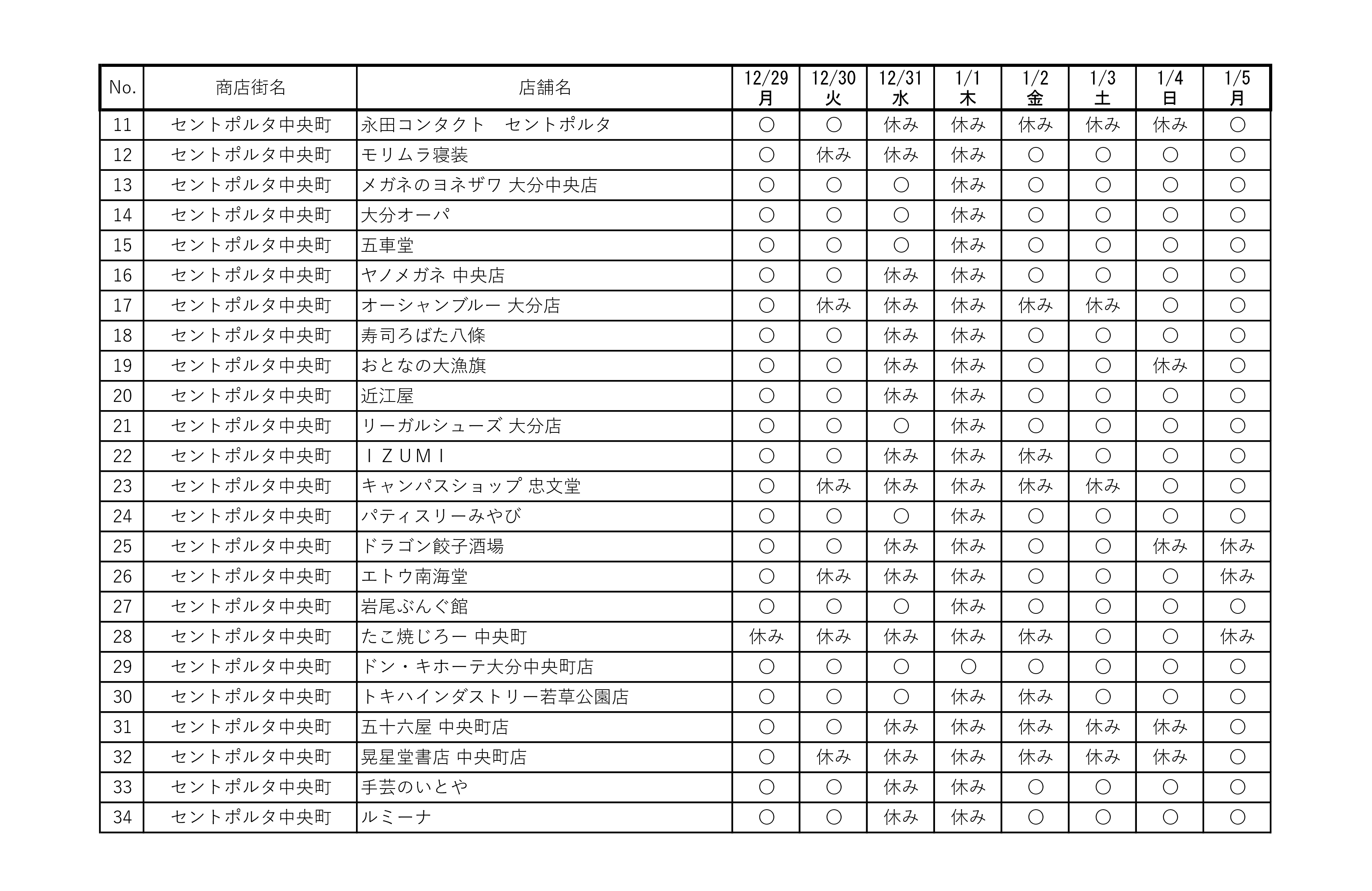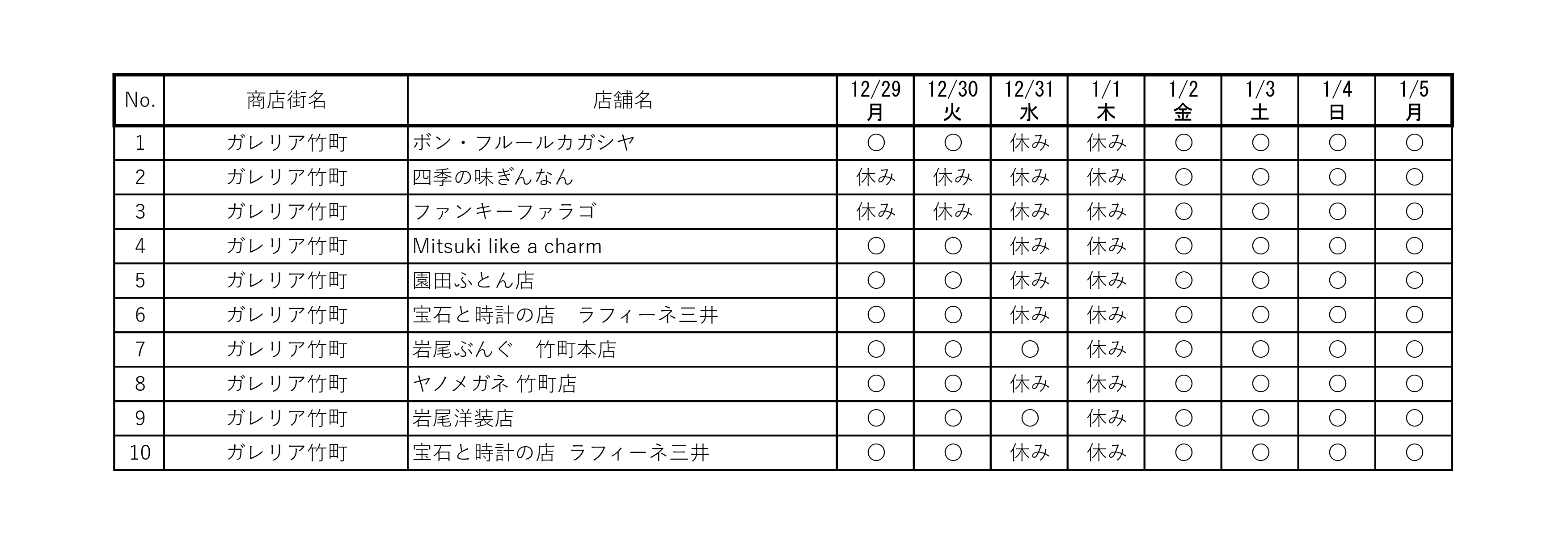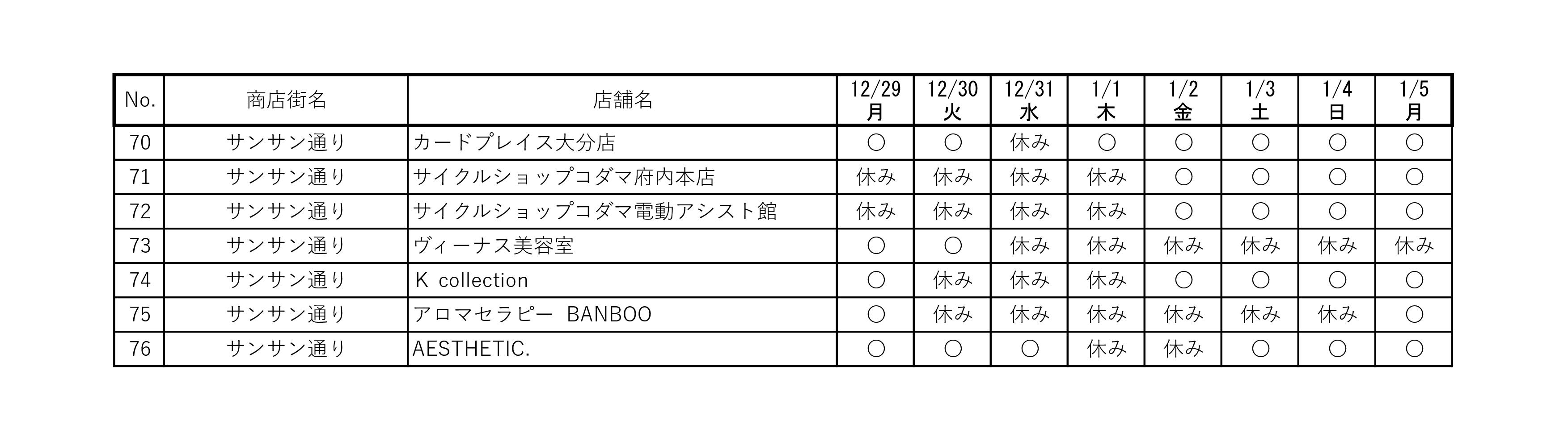 街中にあるお店の営業日についての情報を掲載いたします。